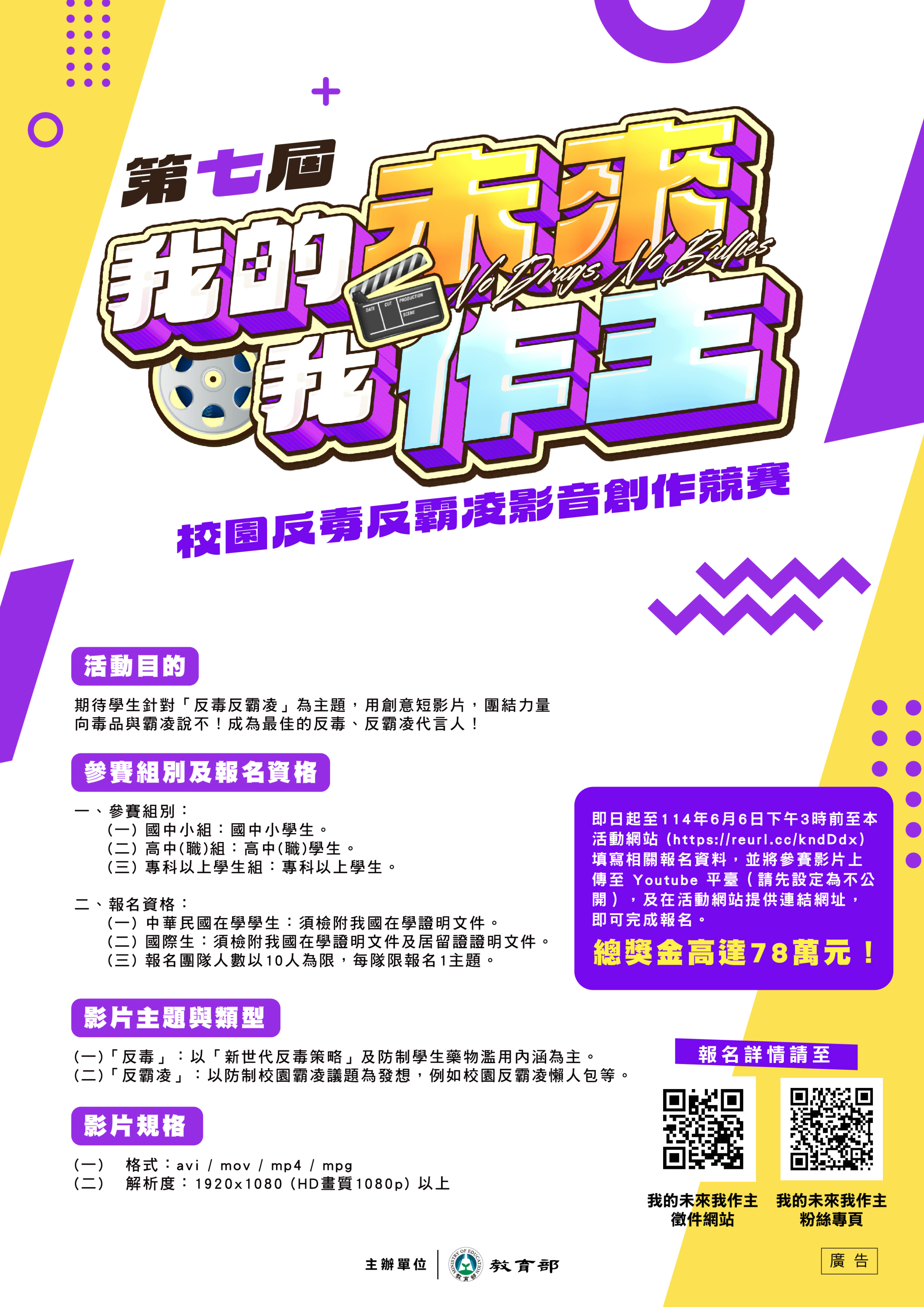 二、因應新型態毒品層出不窮、校園霸凌事件頻傳,為宣達正確資訊,防範毒品危害與霸凌事件,本競賽期以學生角度傳達「反毒反霸凌」主題,透過競賽參與讓學生成為最佳 的反毒、反霸凌代言人,達到正面宣導效果。