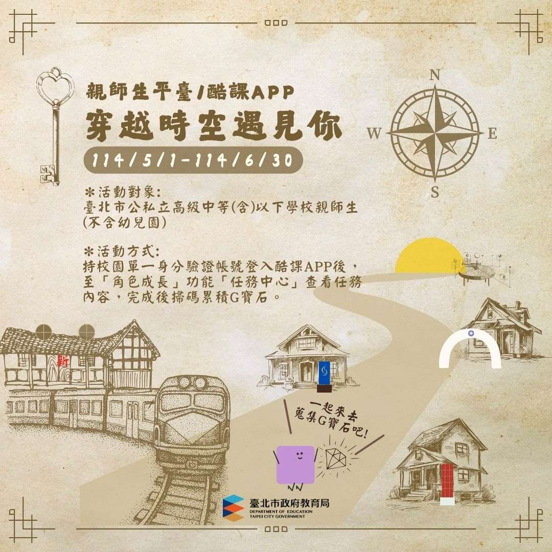 一、本局建置「親師生平臺/酷課APP」,提供本市親師生多元智慧校園服務,為激勵學生自主學習,本次活動與臺北市5社教場館合作,於114年5月至6月舉辦「穿越時空遇見你」 活動任務,鼓勵學生實際走訪場館,深入了解臺北市的歷史發展與在地文化,請貴校鼓勵親師生積極參與。