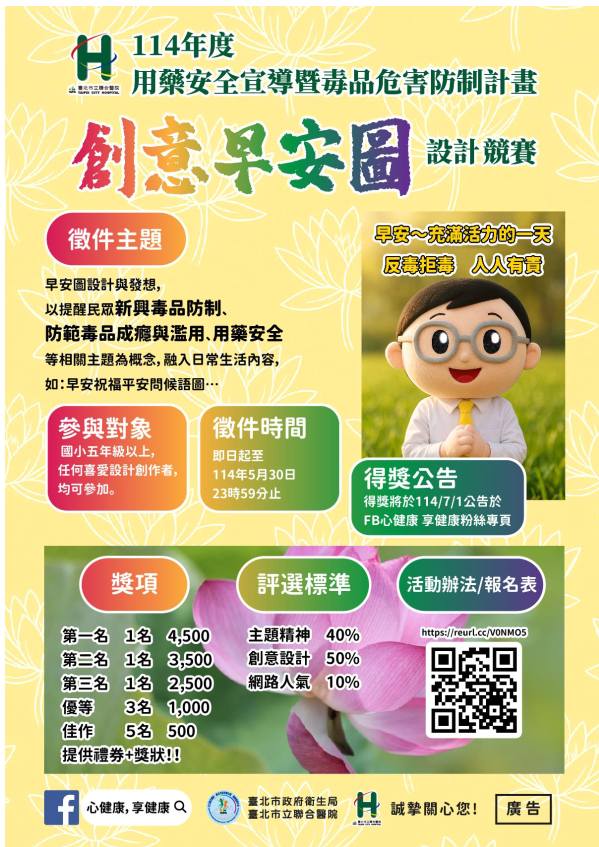 二、為推廣「用藥安全知識及毒品防制」正確觀念,本市聯合醫院辦理「創意早安圖」設計競賽,以加強民眾用藥安全及毒品危害防制藥物濫用之觀念。
