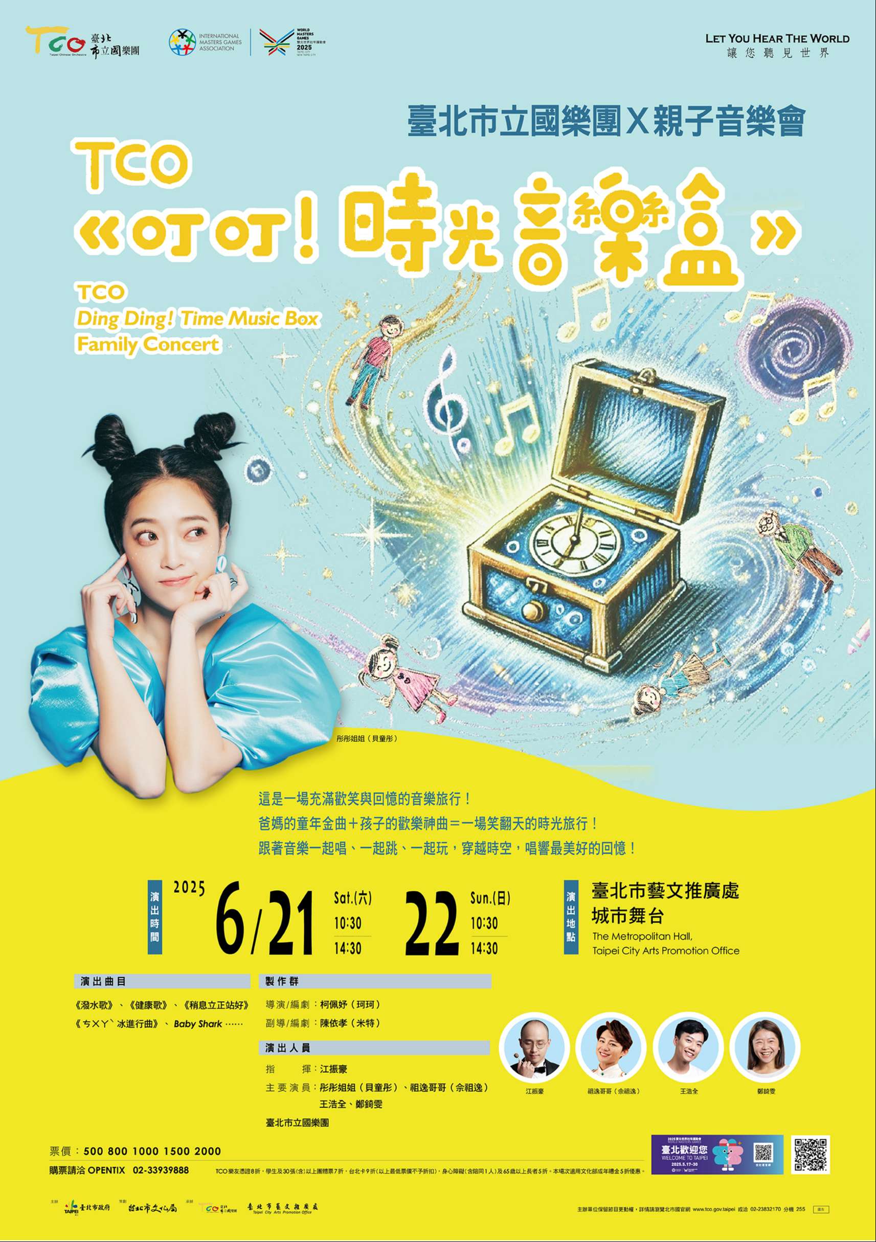 一、臺北市立國樂團(以下簡稱本團)將於114年6月21日、22日假臺北市藝文推廣處城市舞台演出《叮叮!時光音樂盒》親子音樂會。特別邀請彤彤姐姐、祖逸哥哥等小朋友喜愛的哥哥姐姐們與國樂團演出,有爸媽熟悉的童年金曲和孩子最愛的快樂神曲,交織出一場跨世代的歡樂派對。(宣傳海報及DM如附件1、2)