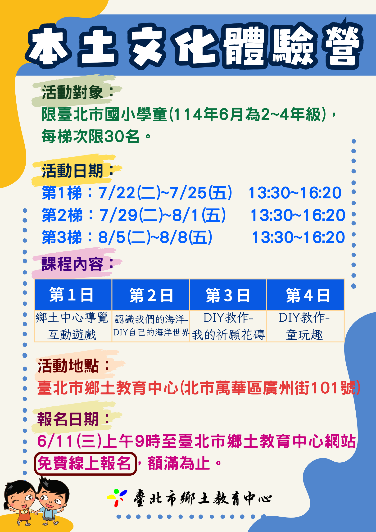 三、本營隊活動課程內容豐富多元,有關詳細課程內容、報名方式請詳見活動計畫或至臺北市鄉土教育中心網站查詢。