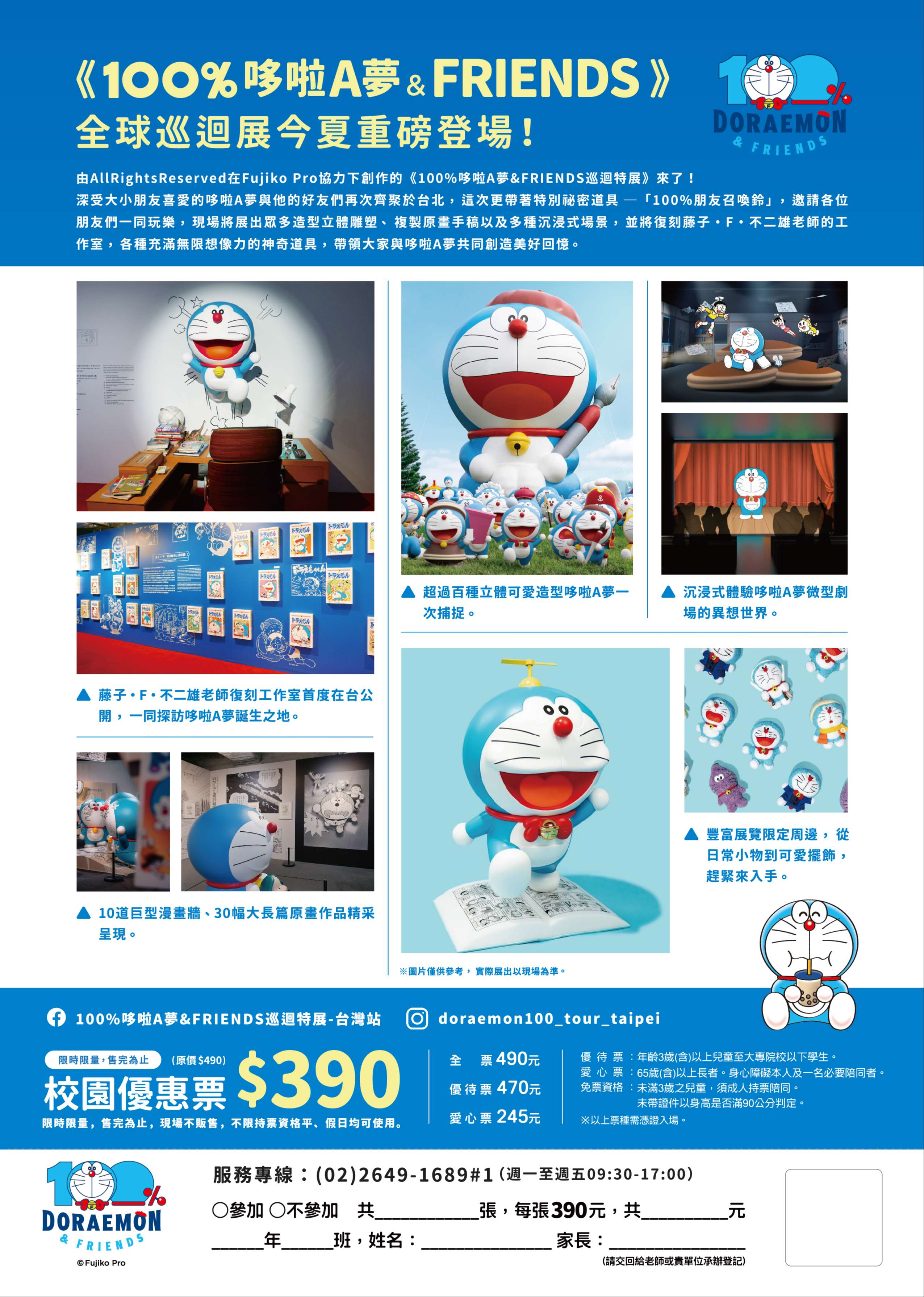 一、《100%哆啦A夢&FRIENDS》全球巡迴展今夏登台!深受大小朋友喜愛的哆啦A夢與他的好友們再次齊聚於台北,這次更帶著特別祕密道具─「100%朋友召喚鈴」,邀請各位朋友們一同玩樂,現場將展出眾多造型立體雕塑、複製原畫手稿以及多種沉浸式場景,還將重現藤子・F・不二雄老師的工作室,以及各種充滿無限想像力的神奇道具,帶領大家與哆啦A夢共同來創造許多美好回憶。