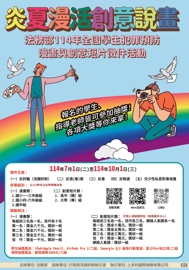 三、徵件期間自114年7月1日至114年10月1日,採線上報名;徵件活動相關訊息及報名資料,請至活動官網、法務部「More法狀元」網站之「年度活 動」,以及facebook搜尋「More法狀元-兒童及青少年犯罪 預防宣導網」下載。