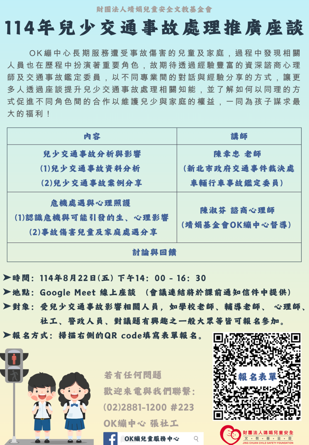 二、靖娟基金會OK繃兒童服務中心將於114年8月22日14時至16 時30分辦理兒少交通事故處理推廣線上座談,期待透過對話方式交通、心理、社會等角度分享中心協助處理交通事故的服務經驗傳達給更多相關工作者,讓不同專業之間以 同理的態度更了解彼此,一同協助為孩子謀取最大的利益。