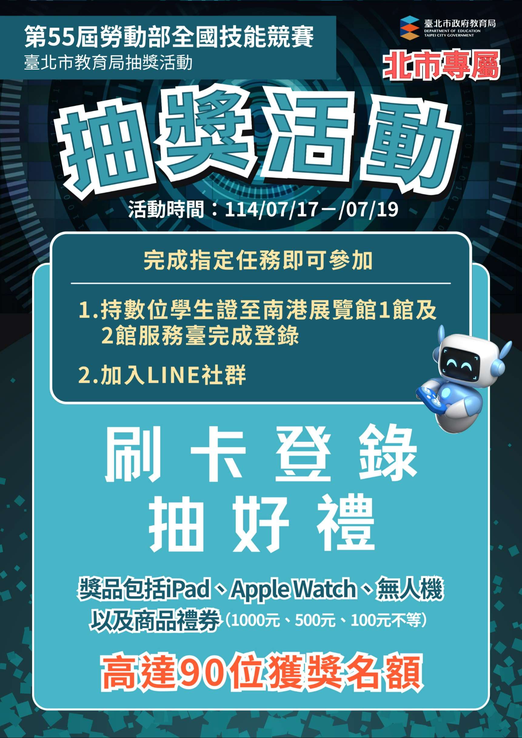 四、現場提供本市學生限定好禮抽獎活動,凡本市各級學校學生持數位學生證至南港展覽館1館及2館,至大會服務臺完成登錄即可參加抽獎,獎品包括平板電腦、智慧手錶、無人機、以及商品禮券(1000元、500元、100元不等),高達90位獲獎名額。
