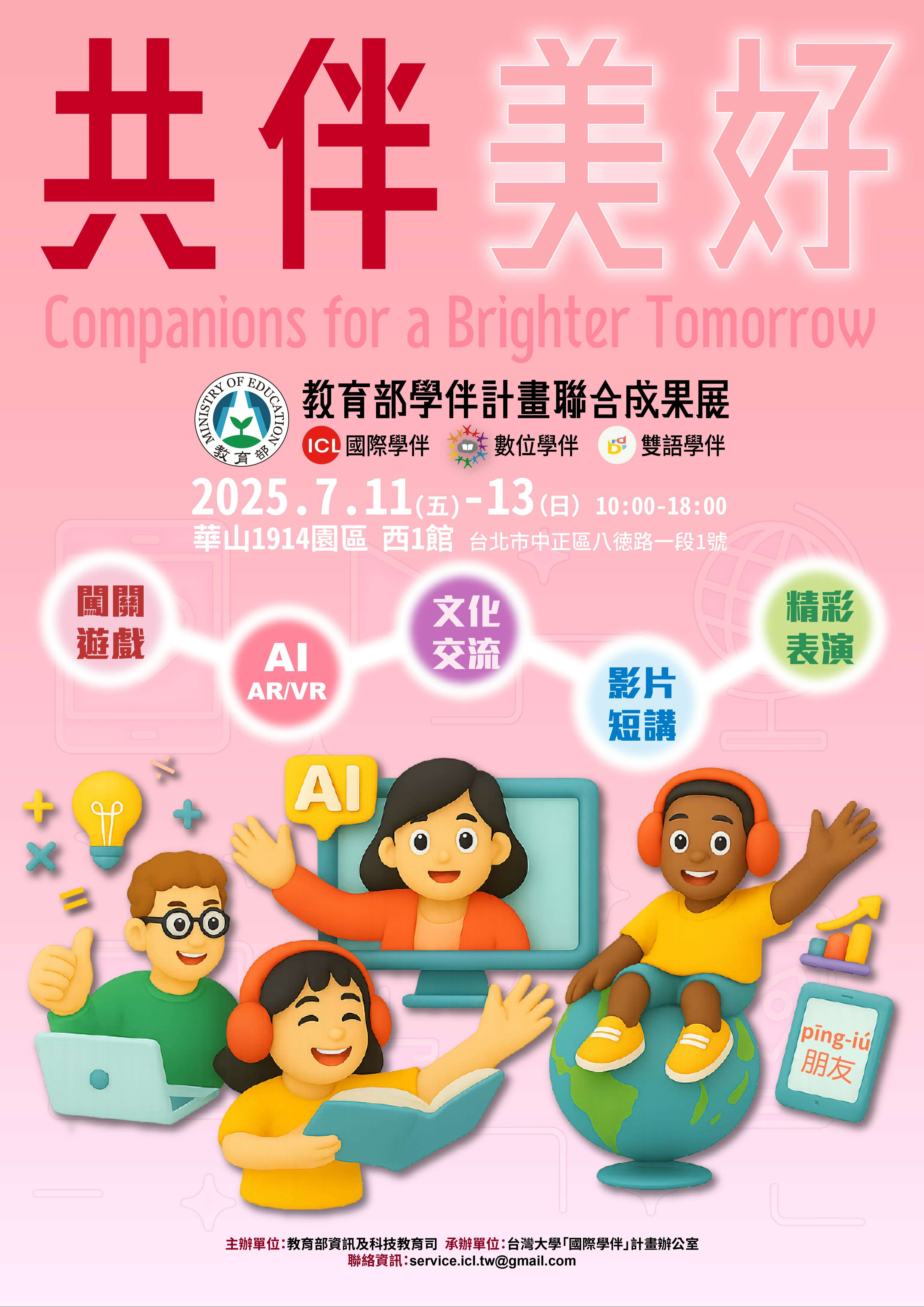 二、教育部推動「數位學伴計畫」、「國際學伴計畫」及「雙語學伴計畫」成果豐碩,邀請學伴計畫團隊、AI相關計畫 及民間企業共同響應,辦理旨揭成果展,歡迎親師生免費參觀,活動資訊摘要如下: