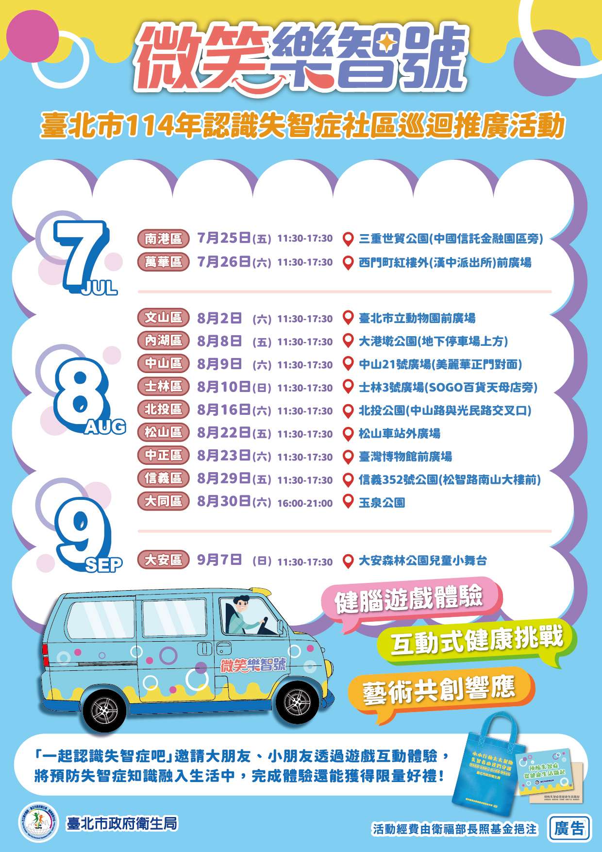一、為增加民眾對失智症的認識及預防,本局114年結合「微笑樂智號」胖卡車,規劃「健腦遊戲體驗」、「互動式健康挑戰」、「藝術共創響應」等多元內容,巡迴本市十二行政區,藉由趣味互動吸引民眾參與,將失智症知識融入生活中。