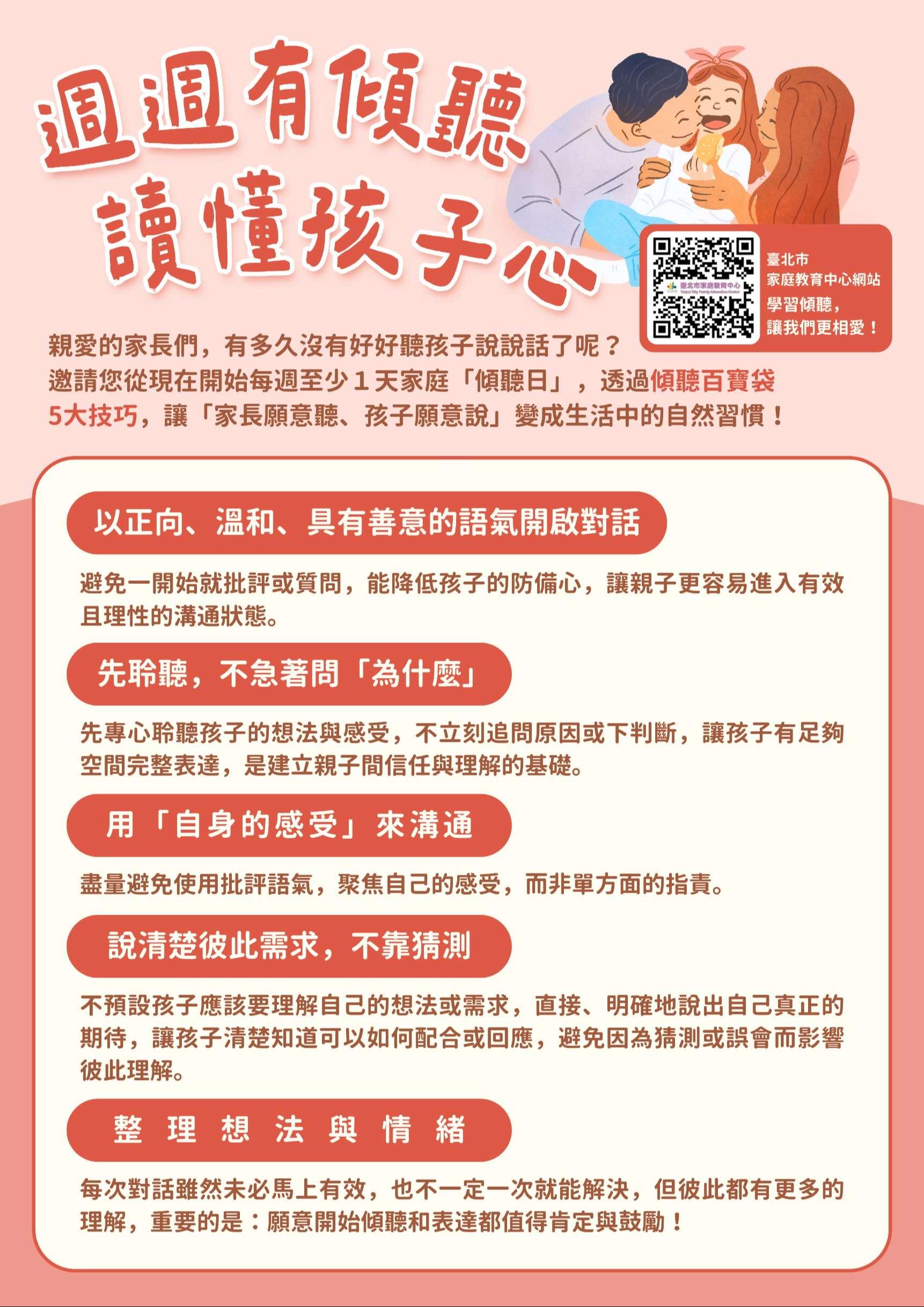 一、為打造「家長願意聽,孩子願意說」的環境,鼓勵所有家長每週至少撥出一天為家庭「傾聽日」,暫時放下手邊的 忙碌,專心聽孩子內心的聲音,透過「傾聽百寶袋」5大技巧,協助家長有效實踐傾聽,促進親子間雙向溝通與情感交流。
