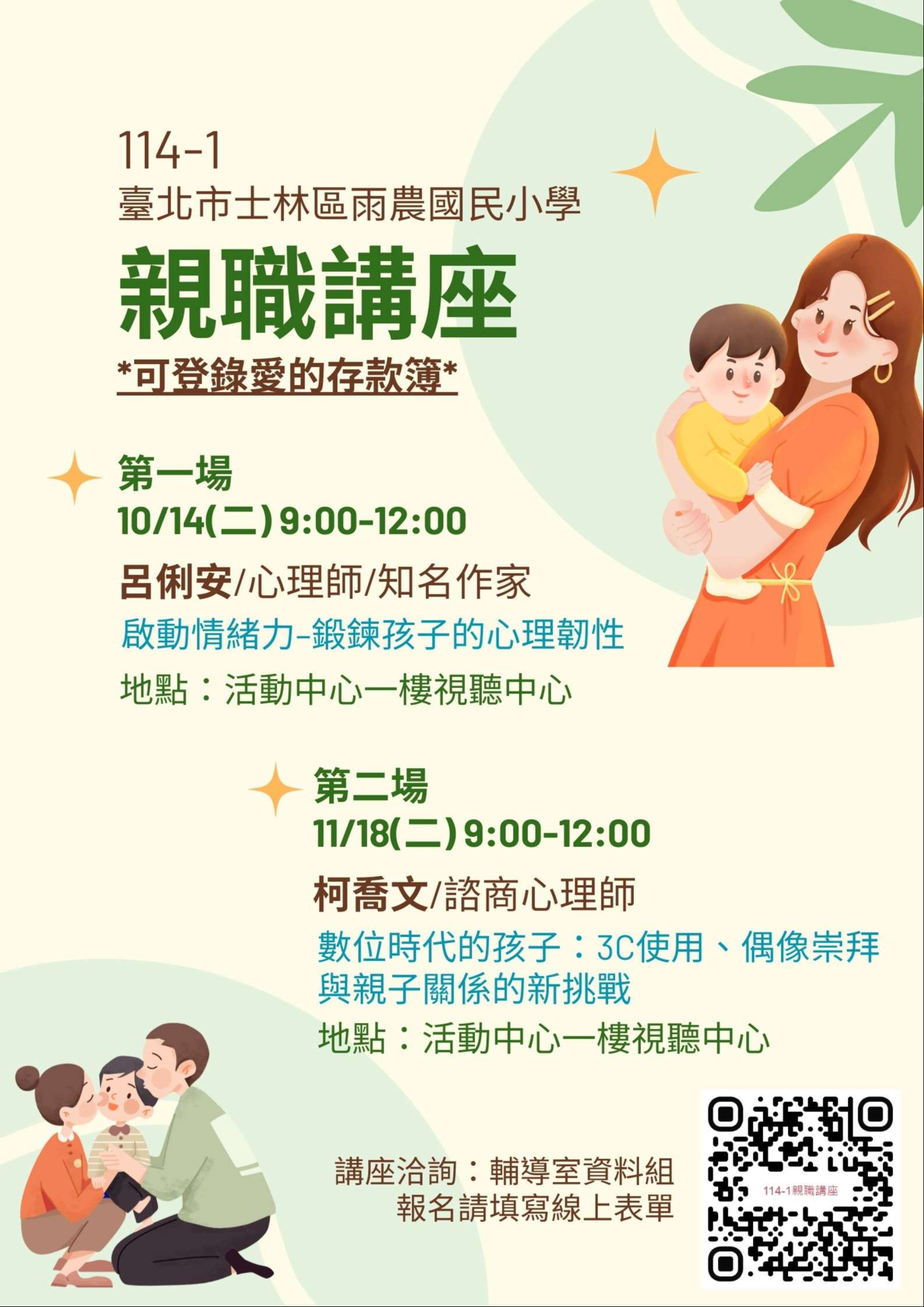 一、本校10至11月共計辦理兩場親職講座課程,結合愛的存款簿學習集點活動給予時數。講座課程內容如下: