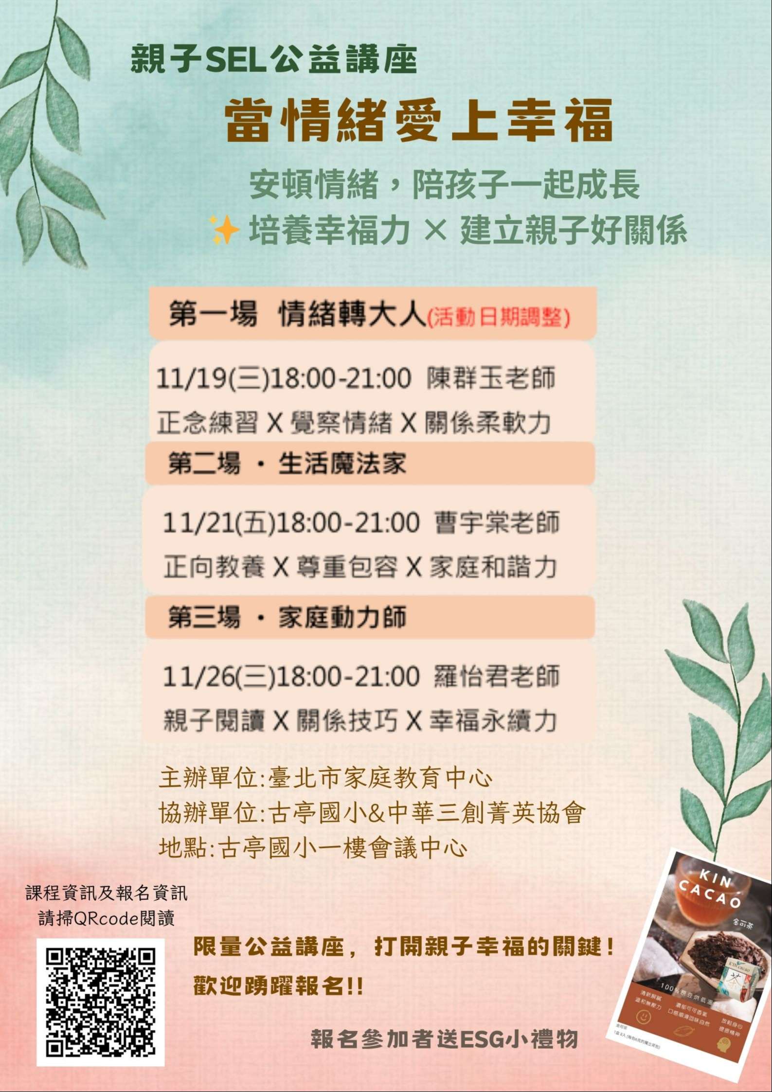 本活動呼應當前在社會情緒學習SEL的需求,我們從學校的家長與親子互動做起,期望攜手社會力量一起永續發展。中華三創菁英協會與古亭國小攜手將於11月辦理三場公益講座,希望讓家長在安頓自己及情緒教養的需求,能有提供更多策略,身心安定,家庭關係和諧,幸福社會永續發展,邀請家長參與及共學。