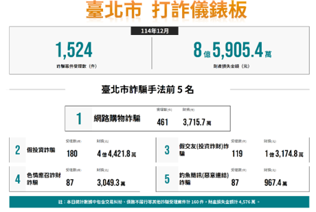 二、經分析本市114年12月各類詐欺案件受理數共計1,524件,財損金額新臺幣(以下同)8億5,905.4萬元,前3大高發詐欺手法受理件數及財損金額: