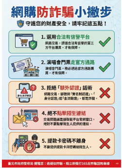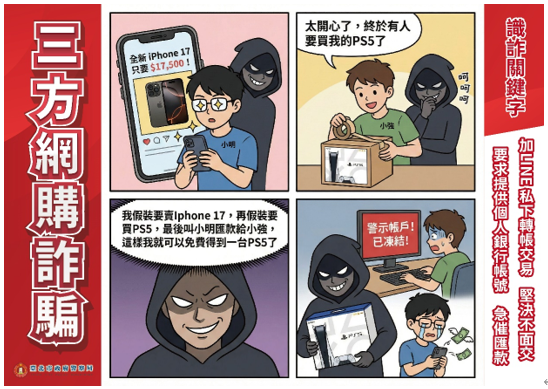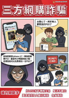 三、近期發現詐騙集團常用「網路購物詐騙」、「三方詐騙」等方式,誘導民眾匯款或轉帳、淪為警示帳戶,為避免詐騙集團藉以行騙,爰彙整宣導圖文素材4張。
