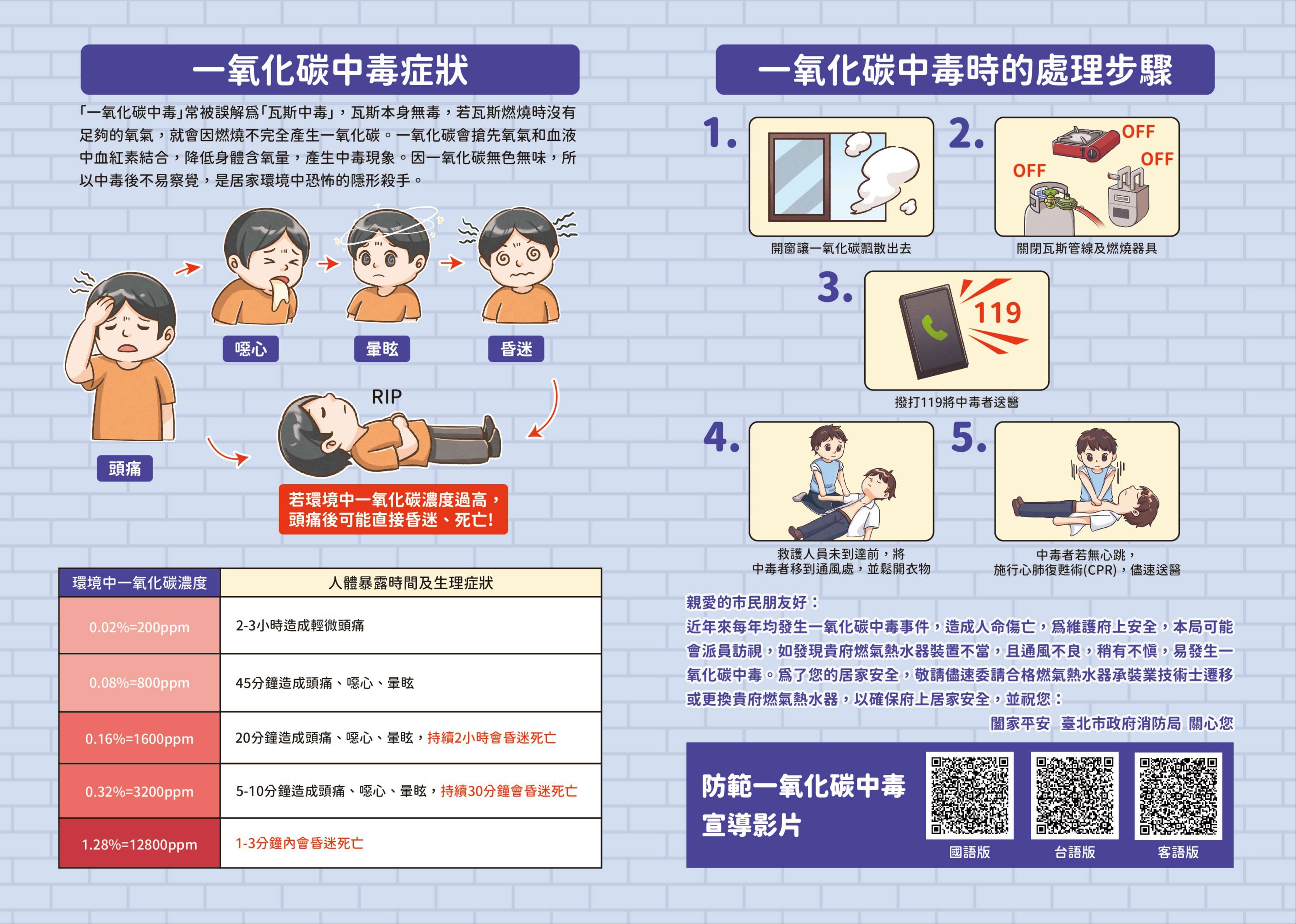 二、於寒流來襲時,注意防範一氧化碳中毒事件之發生,保持居家通風及居家(租賃)住所自我安全檢視等防範一氧化碳中毒觀念。