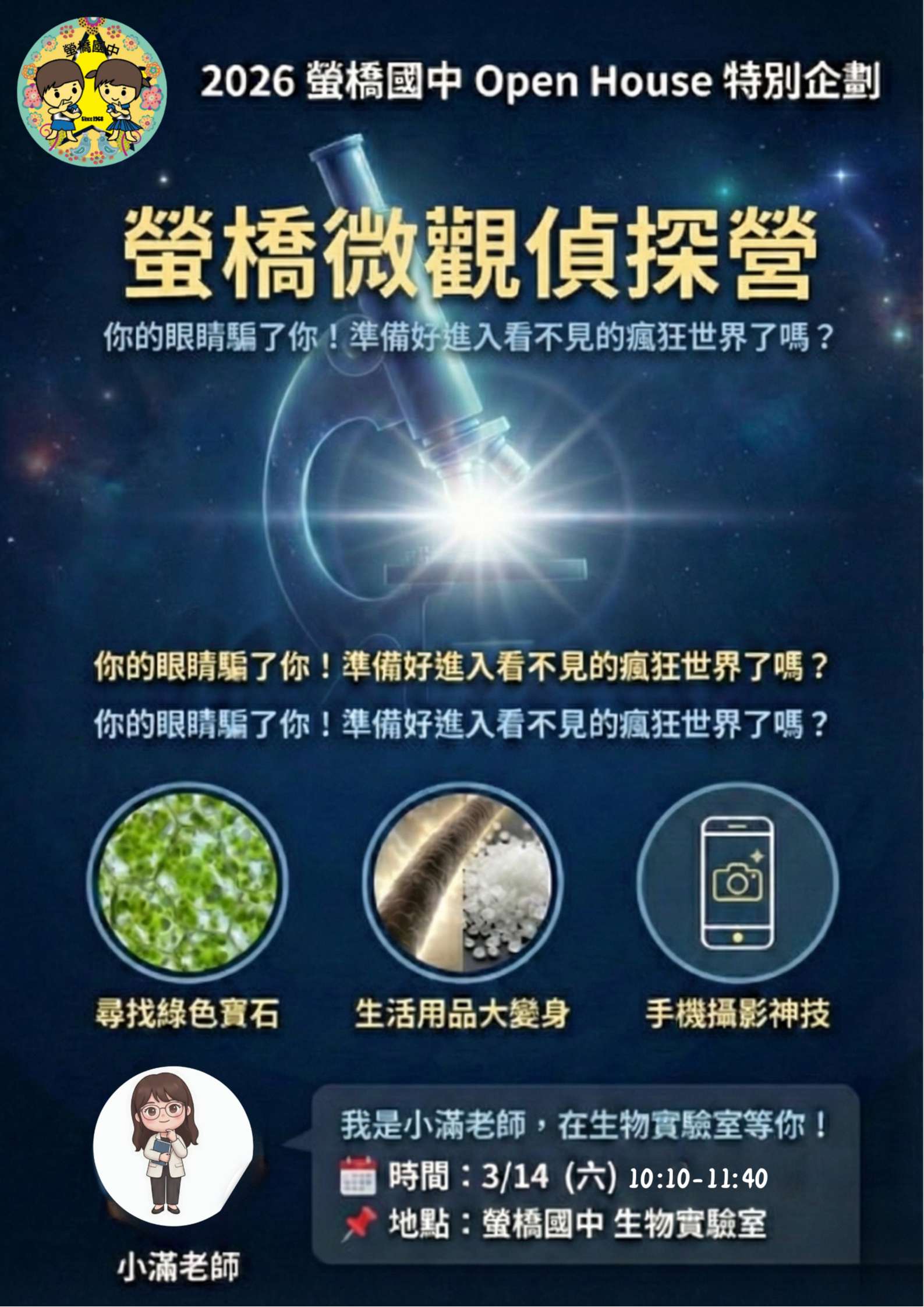 一、緣起:螢橋國中家長會為協助家長增加對國中生活及課程了解,特辦理體驗活動及親子講座,提供國小生瞭解國中課程之機會,藉由課程體驗及家長分享,對未來更適應。