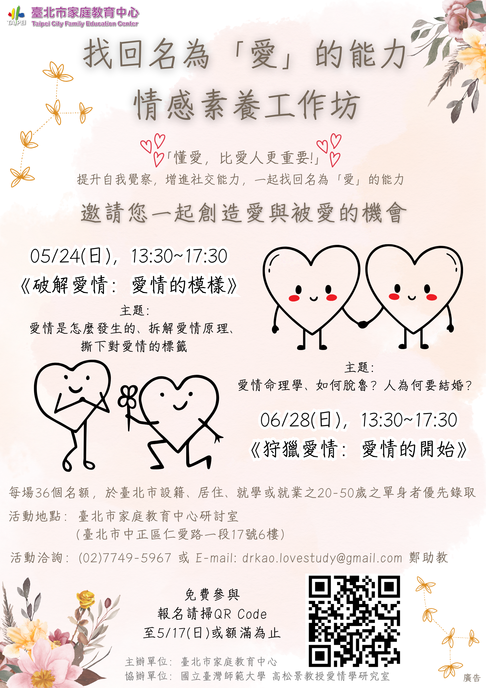 三、請鼓勵所屬單身同仁踴躍參與,並惠予協助於所屬網站宣 傳,文稿內容如下:「臺北市家庭教育中心115年度『找回名為「愛」的能力—情感素養工作坊』,於5月24日及6月28日(星期日)13時30分至17時30分假臺北市家庭教育中心舉辦,活動名額為36人,歡迎年齡20歲以上至50歲之單身者踴躍報名參加(於本市設籍、居住、就學或就業者為優先錄取),活動全程免費參與,詳細內容可於中心網站課程與活動瀏覽及下載, 相關報名問題請寄信E–mail至drkao.lovestudy@gmail.com詢問」