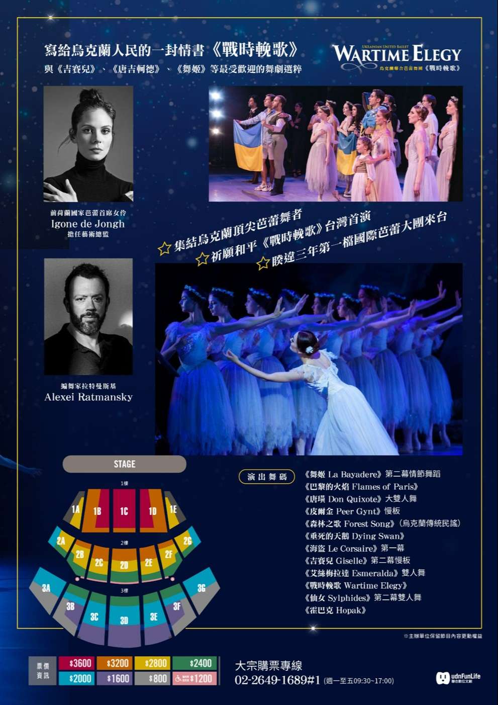 (三)表演介紹:烏克蘭聯合芭蕾舞團(UnitedUkrainianBallet)集結一群烏克蘭頂尖芭蕾舞者,他們來自於烏克蘭各地劇院與舞團,因烏俄戰爭而流離失所,最後落腳荷蘭海牙,在此重拾舞鞋,恢復日常的訓練,組成一支職業舞團,在此作為烏克蘭芭蕾舞者的戰時庇護所。2022年烏克蘭聯合芭蕾舞團陸續巡演英國、澳洲、新加坡、美國等地,所到之處票券銷售一空,感動無數觀眾,讓世人見證藝術撫慰人心的神奇力量。本次舞團將帶來《戰時輓歌》、《吉賽兒》、《唐吉軻德》、《舞姬》等最受歡迎的舞劇選粹。《戰時輓歌WartimeElegy》是當代最重要的編舞家之一拉特曼斯基(AlexeiRatmansky)在烏俄戰爭爆發後的全新創作,但並未充滿政治訊息,相反地,他採用了烏克蘭當代最知名作曲家西爾維斯特洛夫(ValentinSilvestrov)的音樂,加上烏克蘭傳統歌曲,是拉特曼斯基寫給烏克蘭人民的一封情書,向他們堅韌不拔的精神致敬,並祈禱未來的和平。其他精采節目包括《舞姬LaBayadere》充滿動感與異國風情的第二幕;以雙手關節展現不可思議靈活度與生命力的《垂死的天鵝TheDyingSwan》;挑戰男女舞者技巧極限的《海盜LeCorsaire》第一幕;以及《唐吉軻德DonQuixote》的大雙人舞等,其32鞭轉的難度完全不遜於黑天鵝在《天鵝湖》的高潮。此外,舞團更特邀世界其他頂尖舞團的烏克蘭舞星,包括前馬林斯基首席AnastasiaMatvienko與DenisMatvienko,以及英國國家芭蕾的KatyaKhaniukova等人加入客席陣容,為台灣民眾帶來一場最精采的芭蕾盛宴,希望以藝術感動人心,為這個紛擾的世界帶來光明與希望。