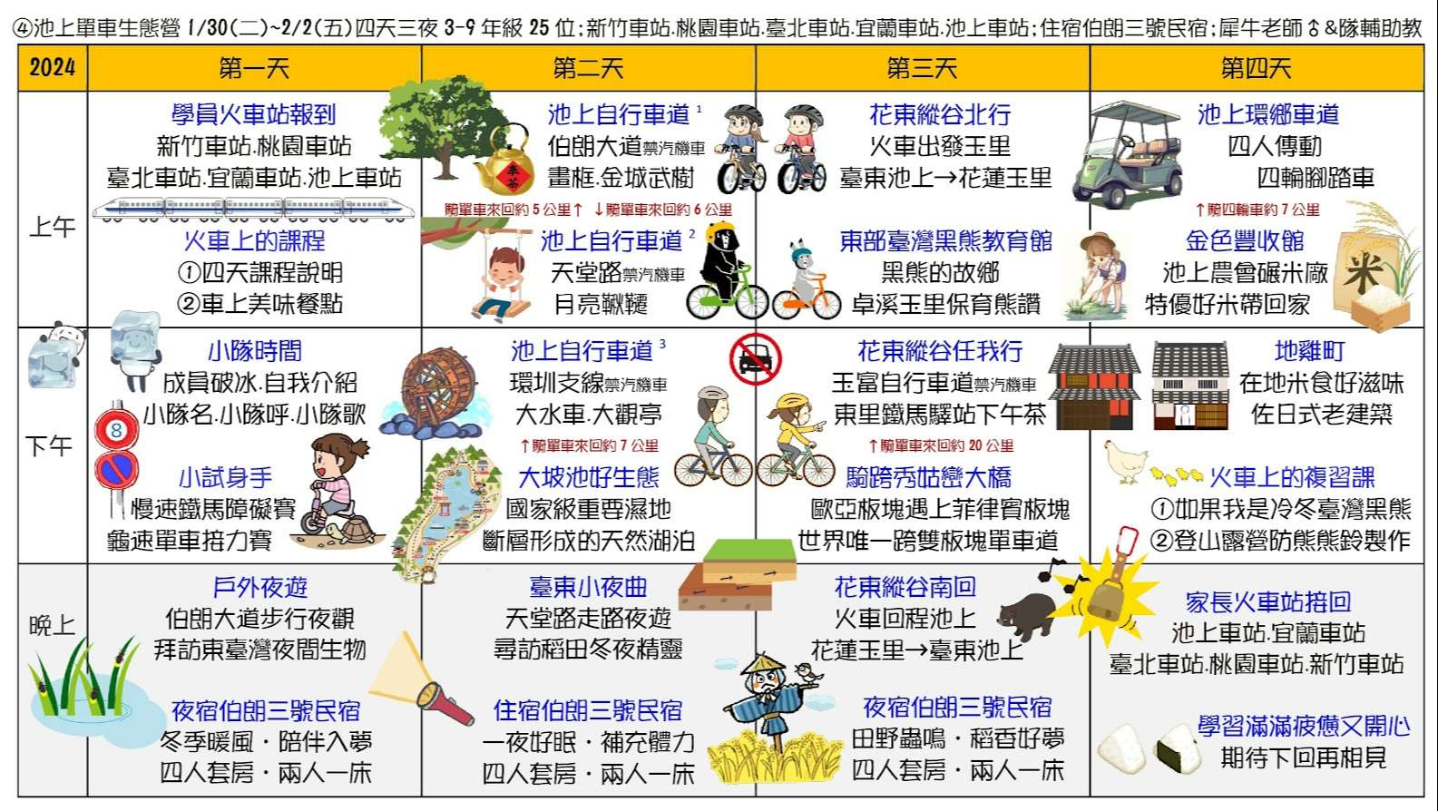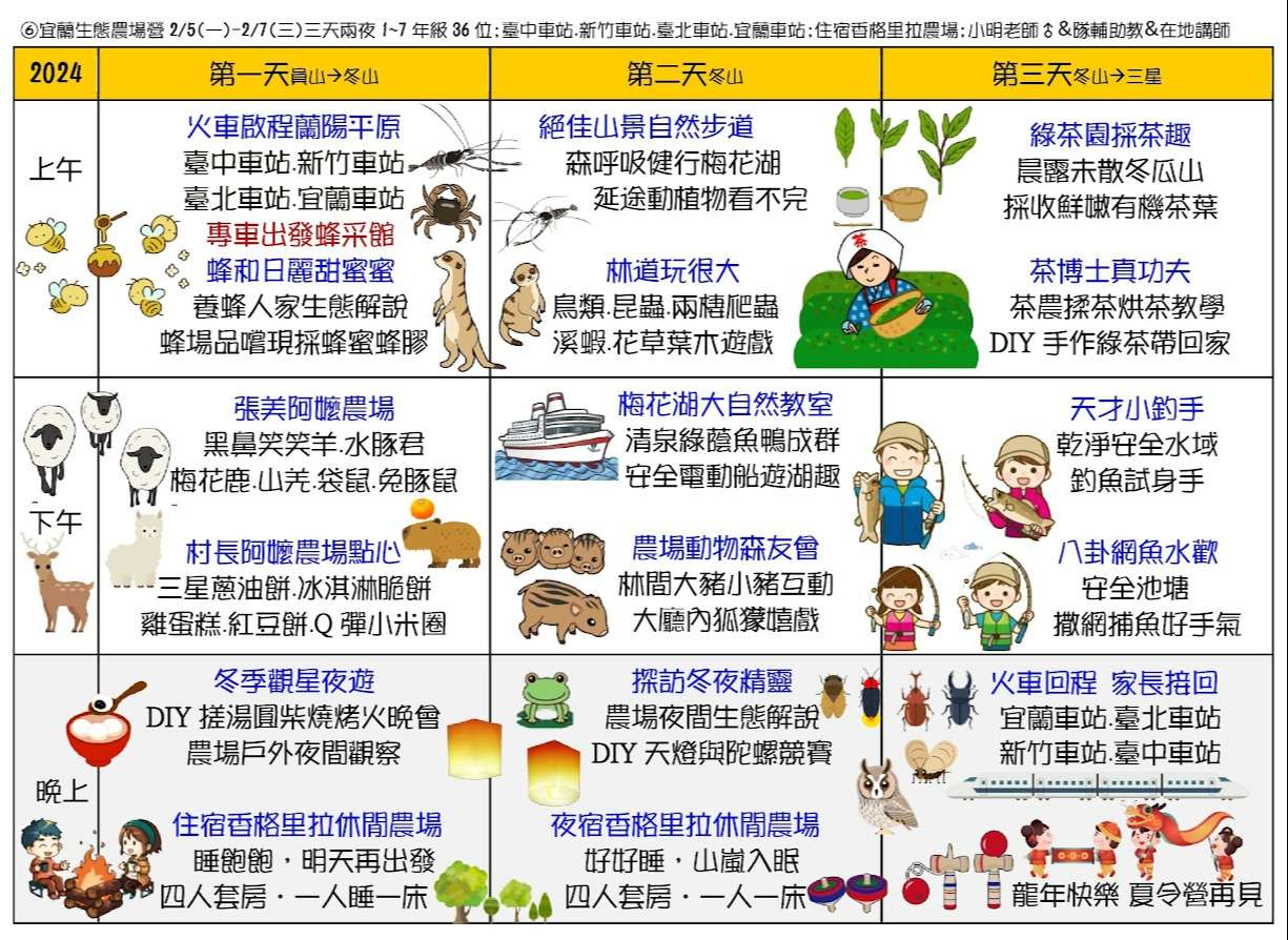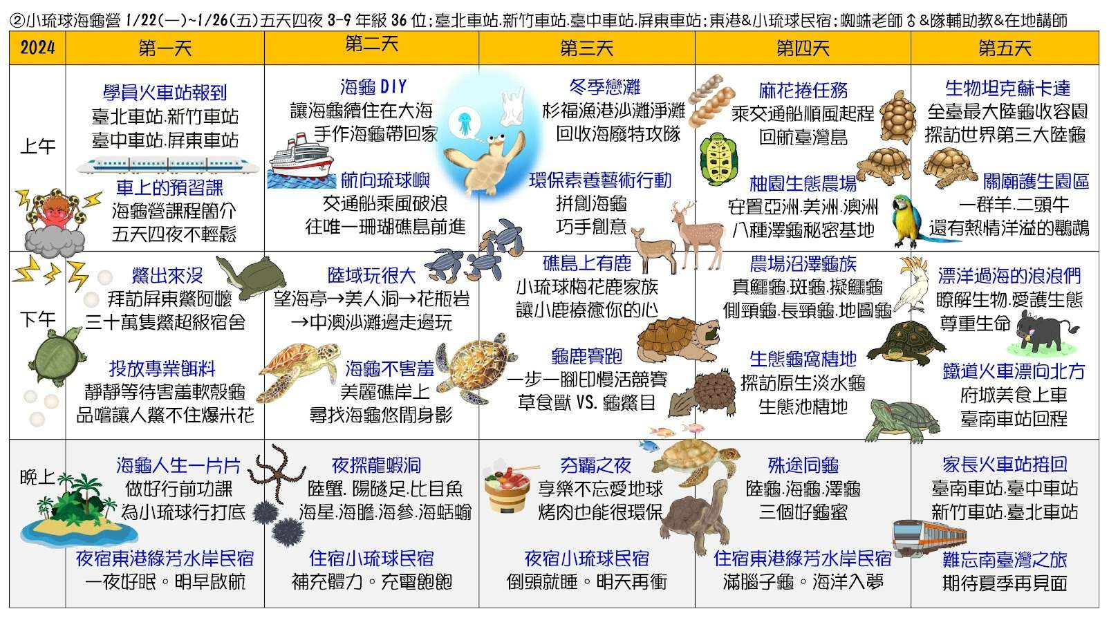 二、六種課程主題為:①蘭陽山野求生營(5天4夜)、②小琉球海龜營(5天4夜)、③仿生科技營(3天2夜)、④貓頭鷹飛羽營(4天3夜)、⑤池上單車生態營(4天3夜)、⑥宜蘭生態農場營(3天2夜)。