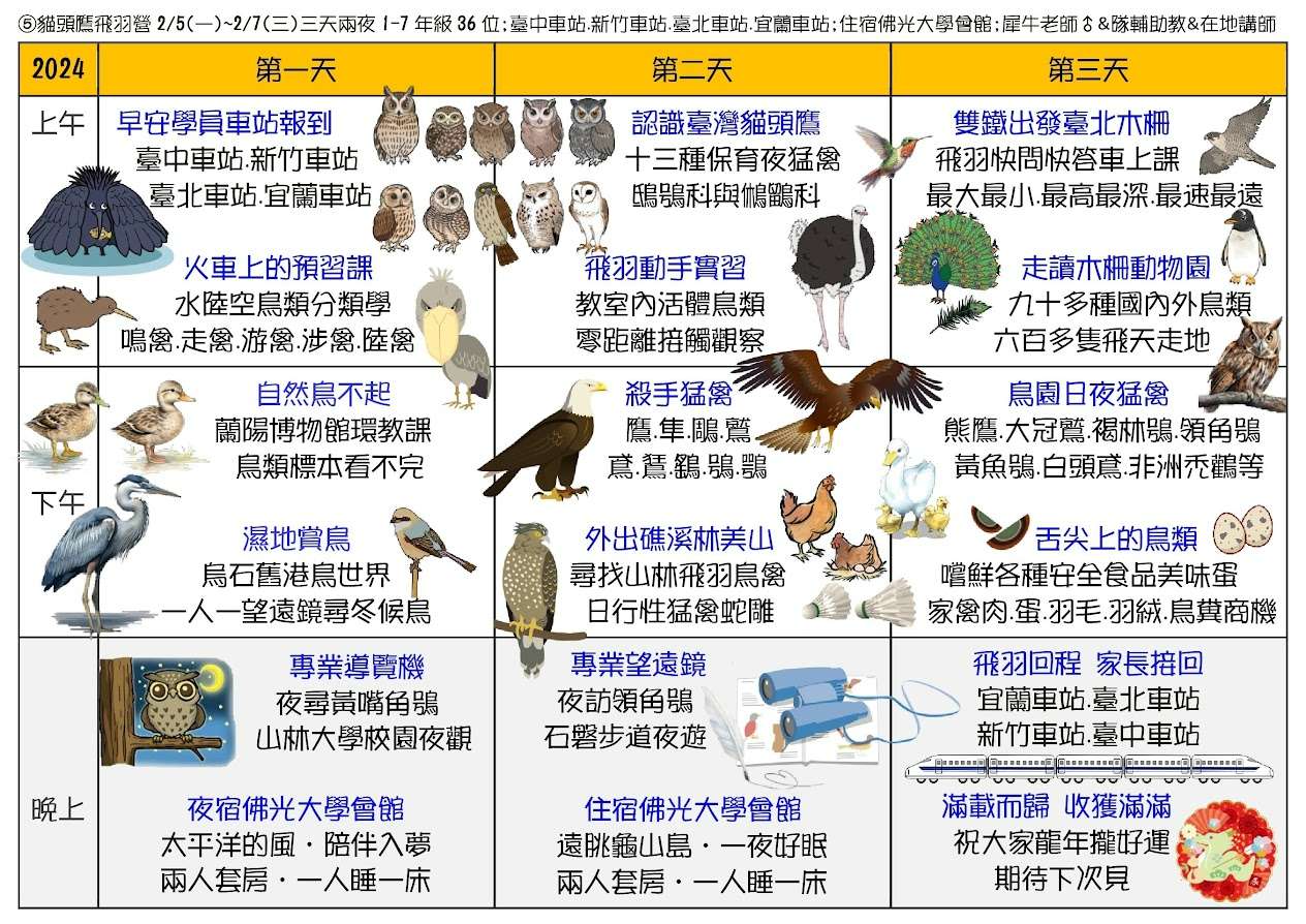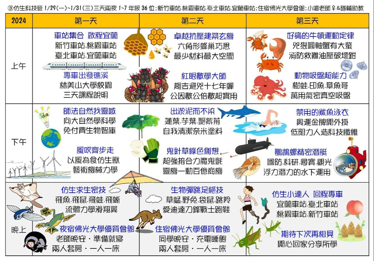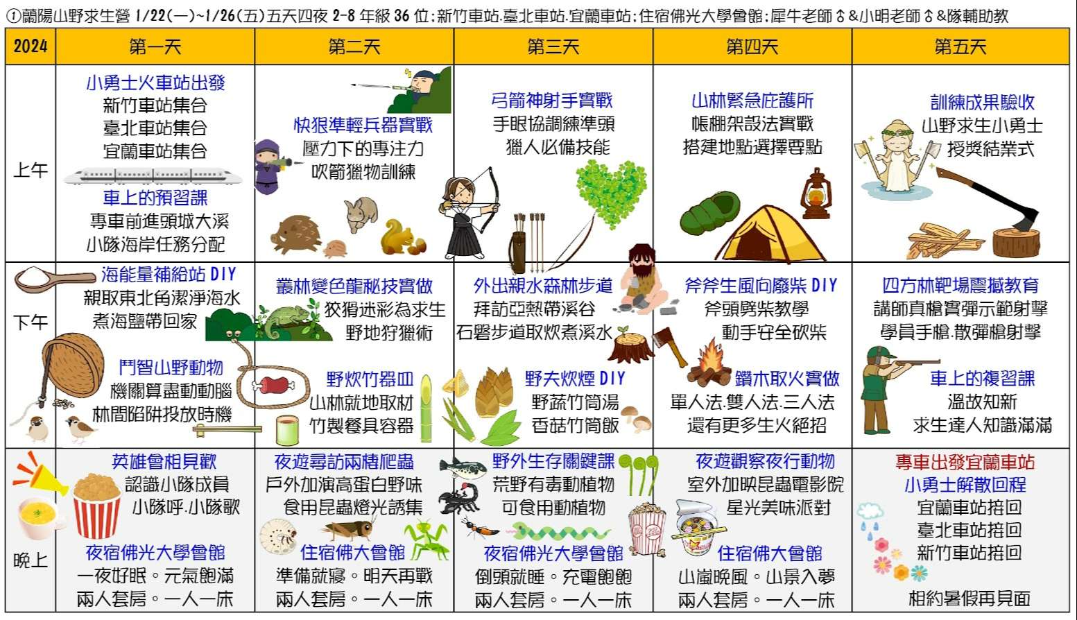 二、六種課程主題為:①蘭陽山野求生營(5天4夜)、②小琉球海龜營(5天4夜)、③仿生科技營(3天2夜)、④貓頭鷹飛羽營(4天3夜)、⑤池上單車生態營(4天3夜)、⑥宜蘭生態農場營(3天2夜)。
