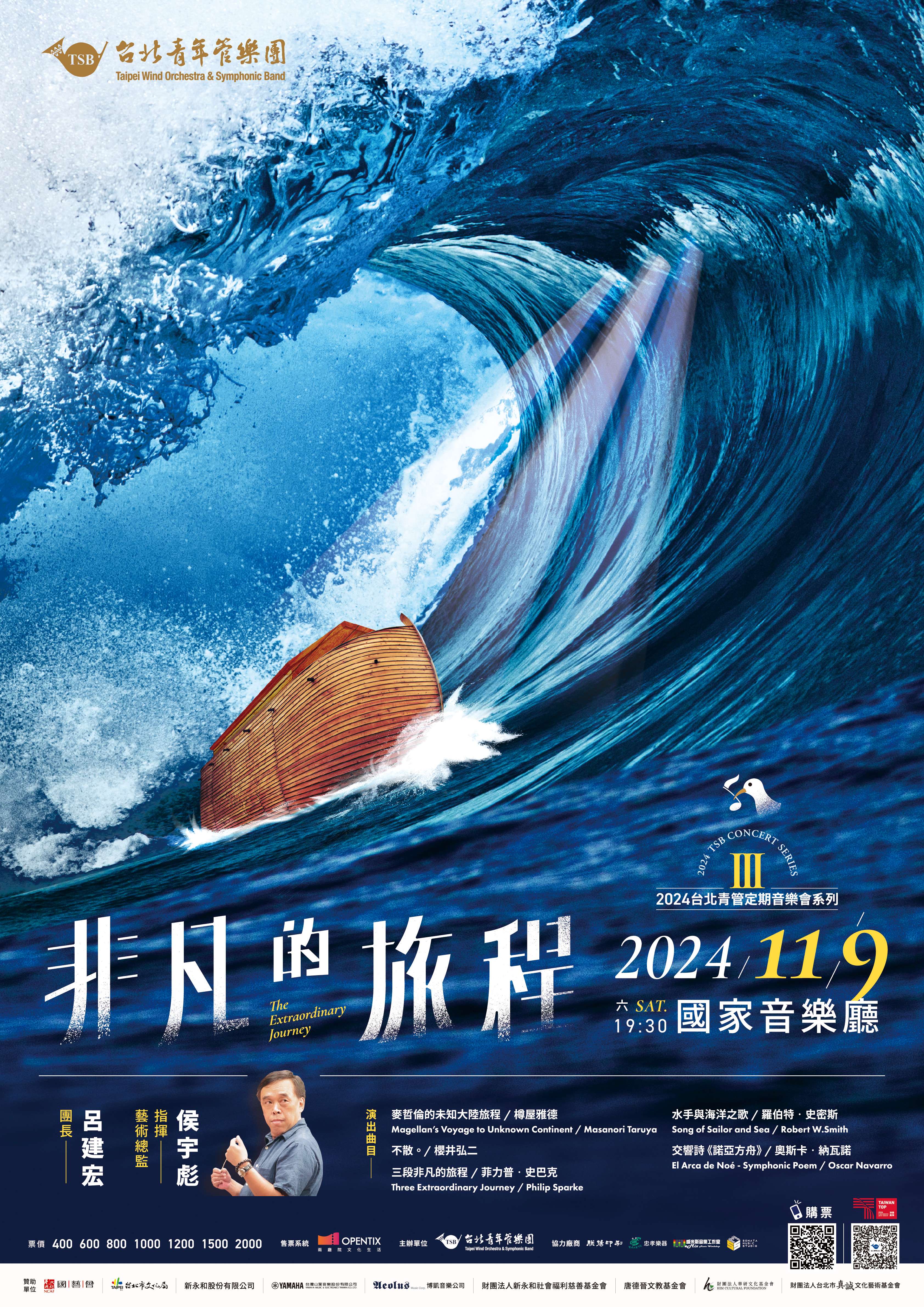 一、2024台北青管定期音樂會系列III,由侯宇彪教授指揮台北青年管樂團演出;以旅遊冒險為主軸,精挑細選相關經典作品與嶄新大作,用音樂帶領您進行一場非凡的旅程。